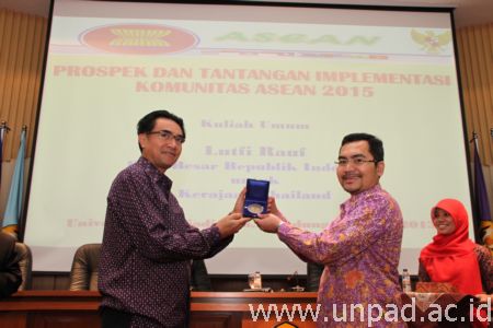 “Opini pesimis tersebut ada karena beberapa negara dinilai tidak siap mengadapi pembentukan tersebut karena tingkat pertumbuhan ekonomi di beberapa negara tidak sama,” ujar Lutfi saat memberikan kuliah umum bertajuk “Prospek dan Tantangan Implementasi Komunitas ASEAN 2015”, Jumat (19/04) di Bale Sawala Gedung Rektorat Unpad Jatinangor. Kuliah umum ini dihadiri oleh Wakil Rektor III Unpad, Dr. med. Setiawan, dr., para dekan, dan mahasiswa Unpad.