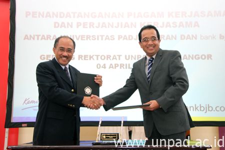 [Unpad.ac.id, 4/04/2013] Unpad melakukan penandatangan piagam Memorandum of Understanding (MoU) dan Perjanjian Kerja Sama dengan BJB. Penandatanganan tersebut dilaksanakan pada Kamis (4/04) di ruang Executive Lounge Lantai 2 Gedung Rektorat Kampus Unpad Jatinangor. Penandatangan ini dihadiri oleh para pimpinan Unpad dan BJB.