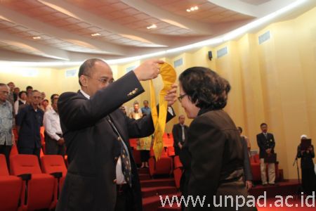 Rektor yang juga Ketua Senat Unpad, Prof. Ganjar Kurnia, saat melantik Prof. Dr. Ir. Husmy Yurmiati, MS dari Fakultas Peternakan menjadi Guru Besar Unpad (Foto: Tedi Yusup)*