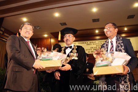 [Unpad.ac.id, 11/09/2013] Memperingati Dies Natalis ke-56, Unpad memberikan sejumlah anugerah penghargaan kepada tokoh, lembaga, dan civitas akademika Unpad yang dinilai berjasa dalam peningkatan kualitas pendidikan, budaya, serta kemajuan Unpad. Penghargaan tersebut diberikan langsung oleh Rektor Unpad, Prof. Ganjar Kurnia saat Sidang Terbuka Senat Unpad pada Dies Natalis ke-56, Rabu (11/09) di Aula Grha Sanusi Hardjadinata Unpad Kampus Iwakoesoemasoemantri, Bandung.