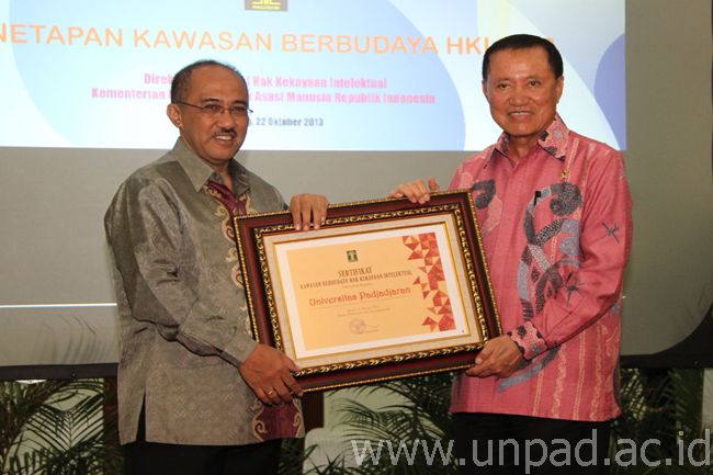 Penetapan Kawasan Berbudaya HKI untuk Unpad dilakukan oleh Menteri Hukum dan HAM RI, Amir Syamsudin, SH., MH., dan diterima oleh Rektor Unpad, Prof. Ganjar Kurnia, di Gedung Sate Bandung, Selasa (22/10) kemarin. Pada kesempatan tersebut, Kemenkumham RI juga menetapkan Provinsi Jawa Barat sebagai “Provinsi Peduli HKI” dan Kabupaten Sumedang sebagai “Kawasan Peduli Indikasi Geografis” serta menyerahkan sertifikat HKI kepada Ubi Cilembu dan Java Preanger Coffee.