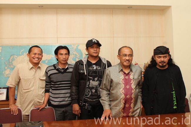 (Dari kiri-kanan) Kepala UPT Humas Unpad Bambang Hermanto, Iman Zimbot dari Karinding Attack, Cuki dari band punk Tcukimay, Rektor Unpad Prof. Ganjar Kurnia dan Man Jasad, personil band Jasad dan juga Karinding Attack usai jumpa pers di kampus Unpad, Bandung, Selasa (22/10). (Foto: Tedi Yusup)