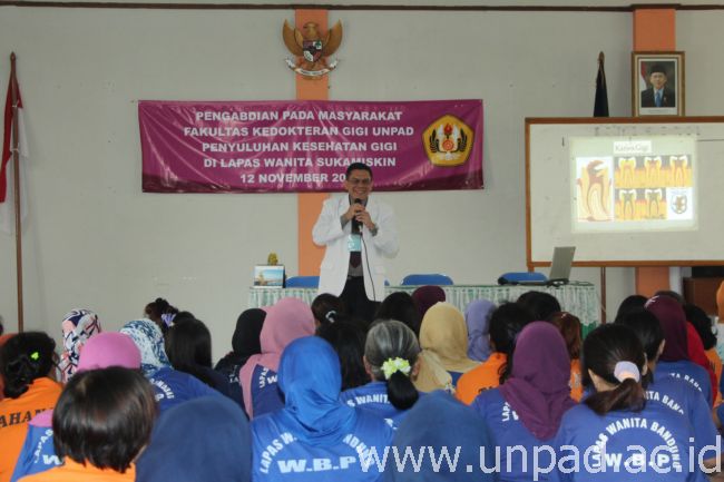 [Unpad.ac.id, 12/11/2013] Sebagai salah satu kegiatan Pengabdian Pada Masyarakat, Fakultas Kedokteran Gigi (FKG) Unpad melakukan Penyuluhan Kesehatan Gigi di Lembaga Permasyarakatan (Lapas) Wanita Sukamiskin Bandung. Kegiatan ini dilakukan untuk meningkatkan derajat kesehatan masyarakat, terutama kesehatan gigi dan mulut. Penyuluhan dilakukan di Aula Lapas Wanita Klas II A Bandung, Selasa (12/11) oleh staf pengajar FKG Unpad, Fahmi Oscandar, drg., Mkes., SpRKG.