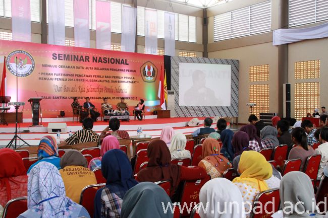 Seminar nasional yang bertema “Peran Partisipasi Pengawas Pemilu bagi Pemilih Pemula Menuju Pemilu 2014 Bersih, Berkualitas, dan Bermartabat” ini digelar oleh Bawaslu RI bekerja sama dengan Unpad. Acara dibuka secara resmi oleh Ketua Lembaga Pengembangan, Pembelajaran, dan Penjaminan Mutu Unpad, Prof. Dr. Sam’un Jaja Raharja, drs., M.Si.
