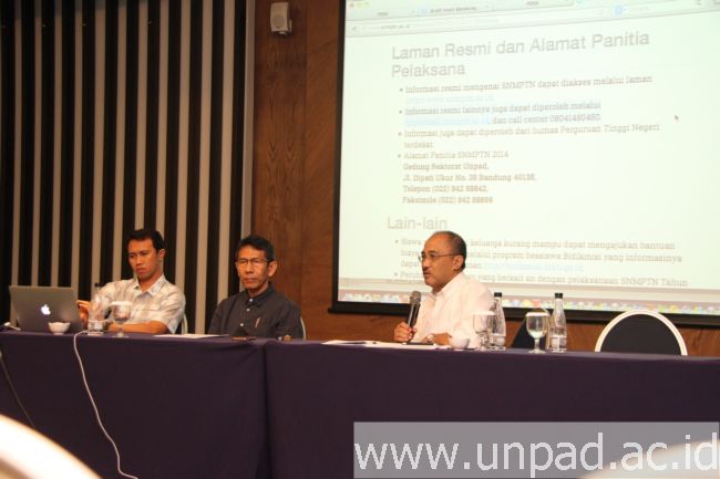 Prof. Ganjar Kurnia (kanan) bersama dengan Koordinator IT SNMPTN 2014, Emil Budianto (tengah), dan Eddy Nurmanto, SSi., MBA (Kepala UPT TI Unpad) saat konperensi pers Pengisian PDSS SNMPTN (Foto oleh: Tedi Yusup)*