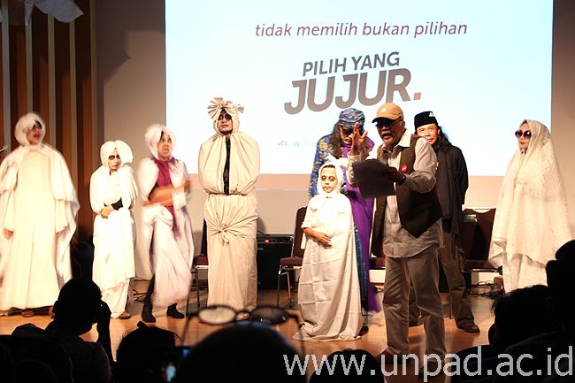 Kegiatan seminar Pemilu Berintegritas 2014 dengan tema “Pilih yang Jujur” ini dibuka oleh Direktur Lembaga Pengembangan Kemahasiswaan dan Alumni Unpad, Dr. Ir. Heryawan Kemal Mustafa, M.Sc., yang merupakan kegiatan kerjasama KPK dan Unpad, dengan harapan masyarakat mampu menggunakan hak pilihnya secara jujur dan memilih calon anggota parlemen maupun calon presiden yang jujur. Hadir sebagai narasumber pada kegiatan ini adalah Yesmil Anwar, dosen Fak. Hukum Unpad yang juga budayawan, Tisna Sanjaya (dosen dan seniman), Iman Soleh (seniman), Adew Habsta (seniman musik) dan perwakilan organisasi “Orang Indonesia”.