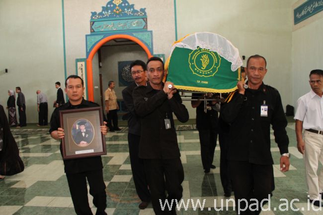 Rektor Unpad, Prof. Ganjar Kurnia, saat melakukan upacara penghormatan terakhir untuk almarhum, Rabu (30/04), di Masjid Al Jihad Kampus Unpad, Jalan Dipatiukur No. 35, Bandung mengungkapkan, almarhum adalah salah satu tolok ukur bagi perkembangan FEB dan program Pascasarjana di Unpad.