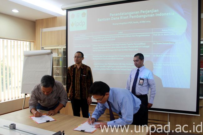Bersama dengan Ketua Lembaga Penelitian dan Pengabdian Kepada Masyarakat (LPPM) Unpad, Prof. Dr. Wawan Hermawan, Dr. Agung menandatangani kontrak penelitian untuk 1 tahun pertama dengan LPDP, Senin (26/05) lalu di Jakarta. Pendanaan riset oleh LPDP ini adalah kali pertama yang berhasil diraih Unpad pascasosialisasi program tersebut pada Maret 2013 lalu.