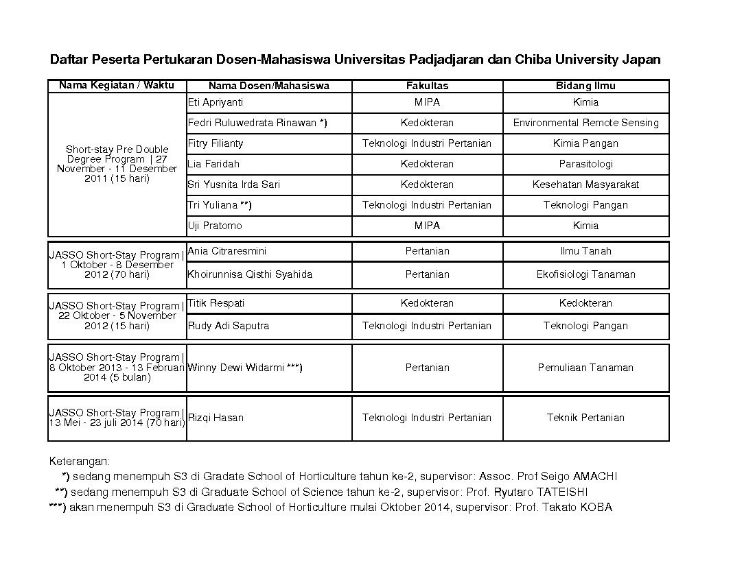 [Unpad.ac.id, 7/08/2014] Dua orang mahasiswa Unpad, Winny Dewi Widarmi dari Magister Ilmu Tanaman dan Rizqi Hasan dari prodi Teknik dan Manajemen Industri Pertanian Fakultas Teknologi Industri Pertanian (FTIP) Unpad berkesempatan mengikuti “Japan Student Service Organization (JASSO) Short-Stay Program” di Chiba University, Jepang.