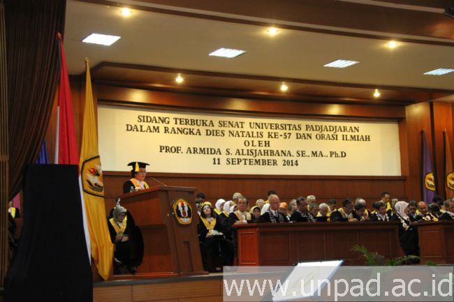 [Unpad.ac.id, 11/09/2014] Hari ini, Kamis (11/09), Unpad memperingati Dies Natalis yang ke-57. Dalam pidatonya, Rektor Unpad, Prof Ganjar Kurnia mengatakan bahwa peringatan Dies Natalis pada hakekatnya adalah ajang untuk “muhasabah” atau evaluasi diri atas berbagai hal yang sudah dilakukan, untuk direfleksikan pada perencanaan dan implementasi masa depan yang lebih baik. Salah satu hal yang patut untuk disyukuri adalah telah didapatnya pengakuan dari Kementerian Pendidikan dan Kebudayaan RI, berupa mandat untuk menjadi PTN Badan Hukum.