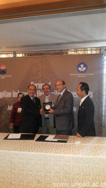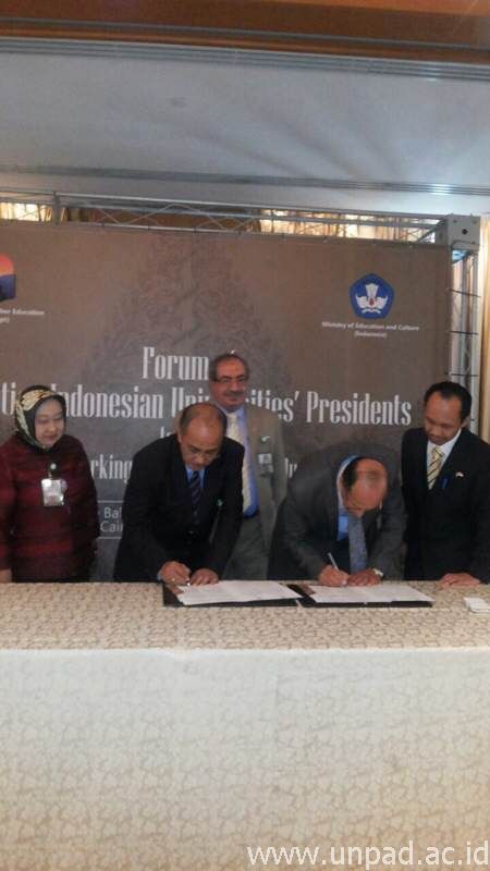 [Unpad.ac.id, 20/09/2014] Sebagai upaya peningkatan pengembangan kerja sama penelitian di bidang energi dan pangan, Rektor Unpad Prof. Ganjar Kurnia menandatangani Memorandum of Understanding (MoU) dengan Desert Research Center (DRC) Mesir yang diwakili oleh Direktur DRC Prof. Dr. Mohamed Essa Abdel Rahman, di Nile Ball Room Four Seasos Hotel, Kairo, Kamis (18/9) siang waktu setempat. Kerja sama ini merupakan bagian dari rangkaian kegiatan Joint Working Group on Higher Education Egypt-Indonesia (JWG-HEEI) Yalla Indonesia 2014 di Kairo Mesir yang diselenggarakan oleh KBRI Mesir bekerja sama dengan Ditjen Dikti.