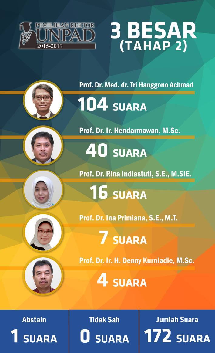Dengan demikian, dua nama yang tidak lanjut pada proses pemilihan tahap kedua adalah Prof. Dr. Ir. H. Denny Kurniadie, M.Sc., dan Prof. Dr. Ina Primiana, S.E., M.T. Menurut Ketua Panitia Pemilihan Rektor Unpad 2015-2019, Prof. Dr. Ir. Soeparna, M.S., tiga nama tersebut akan diajukan kepada Menteri Riset Teknologi dan Pendidikan Tinggi.