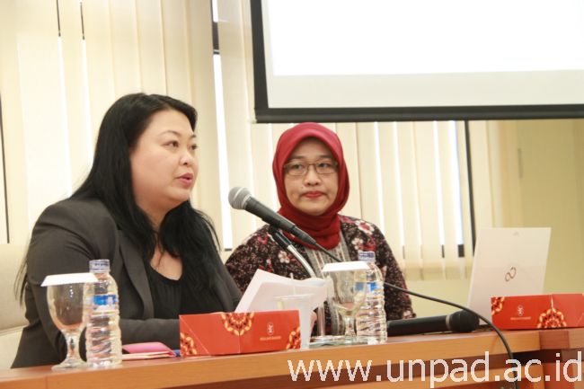 Debbie Nip (kiri) International Affairs Specialist Borlaug Fellowship Program dan Kepala UPT Kerja Sama Unpad, Anne Nurbaiti, PhD saat menyosialisasikan Borlaug Fellowship Program di Gedung Rektorat Unpad, Jatinangor, Jumat (23/01). (Foto oleh: Tedi Yusup)*