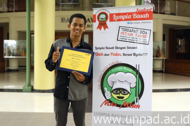 [Unpad.ac.id, 4/02/2015] Berkat bisnis lumpia basah Seafood “Mas Miun” yang dijalaninya, Mahasiswa Fakultas Teknologi Industri Peranian (FTIP) Universitas Padjadjaran, Rizky Ananda, berhasil menjadi juara 1 Kategori Mahasiswa Bidang Usaha Boga pada Wirausaha Muda Mandiri 2014 untuk Kanwil VI Jawa Barat. Dengan demikian, ia berhak menjadi salah seorang wakil Jawa Barat untuk menjadi Finalis Nasional pada ajang tersebut yang digelar Maret 2015 mendatang.