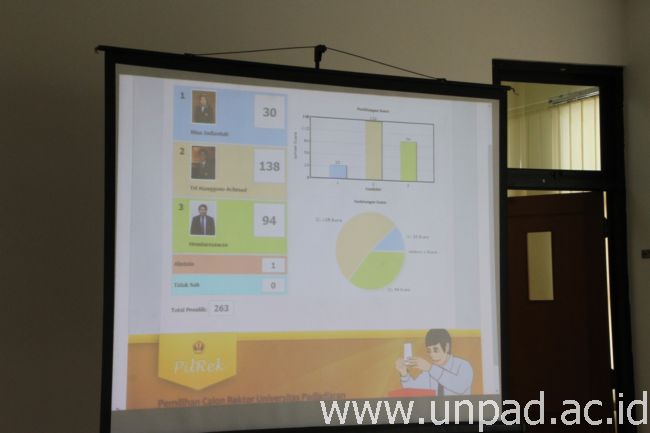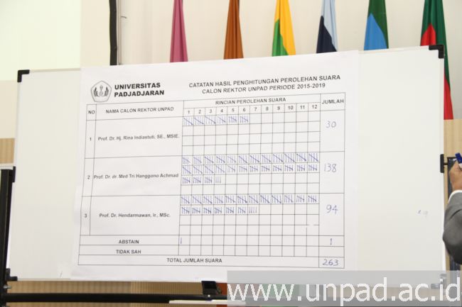 Total suara yang masuk pada proses pemilihan di Sidang Pleno Senat Unpad berjumlah 263 suara dengan rincian 171 suara yang berasal dari Anggota Senat Unpad dan 92 suara yang berasal dari Menteri Riset dan Teknologi Pendidikan Tinggi RI. Dalam acara tersebut, Menristekdikti RI diwakili oleh Direktur Pendidik dan Tenaga Kependidikan Ditjen Pendidikan Tinggi, Prof. Supriadi Rustad, M.Si.