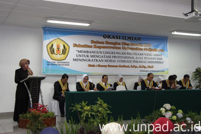 Hal tersebut ia sampaikan saat Orasi Ilmiah pada acara Dies Natalis ke-21 Fakultas Keperawatan Unpad, di kampus Fakultas Keperawatan Unpad Jatinangor, Selasa (29/09). Orasi Ilmiah yang ia bacakan berjudul “Membangun Lingkungan Pekerjaan yang Sehat untuk Mengatasi Professional Role Tension dan Meningkatkan Moral Courage Perawat Indonesia”.