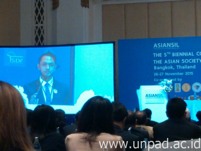 [Unpad.ac.id, 30/11/2015] Empat dosen Fakultas Hukum (FH) Unpad menjadi peserta dalam kegiatan The 5th Biennial Conference of The Asian Society of Internasional Law (AsianSIL) di Bangkok, Thailand, 26 – 27 November lalu. Empat dosen tersebut masing-masing mepresentasikan makalahnya di ajang yang digelar oleh AsianSIL, sebuah organisasi internasional pemerhati hukum internasional di Asia tersebut.