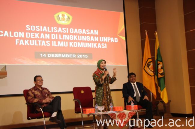 [Unpad.ac.id, 14/12/2015] Dua Calon Dekan Fakultas Ilmu Komunikasi (Fikom) Universitas Padjadjaran, Dr. Atwar Bajari, M.Si dan Dr. Dadang Rahmat Hidayat, melakukan sosialisasi gagasan pada hari ini, Senin (14/12) di Auditorium Pascasarjana Fikom Unpad, Jatinangor. Sosialisasi gagasan ini merupakan salah satu rangkaian seleksi Dekan Fakultas di Lingkungan Unpad periode 2016-2021.