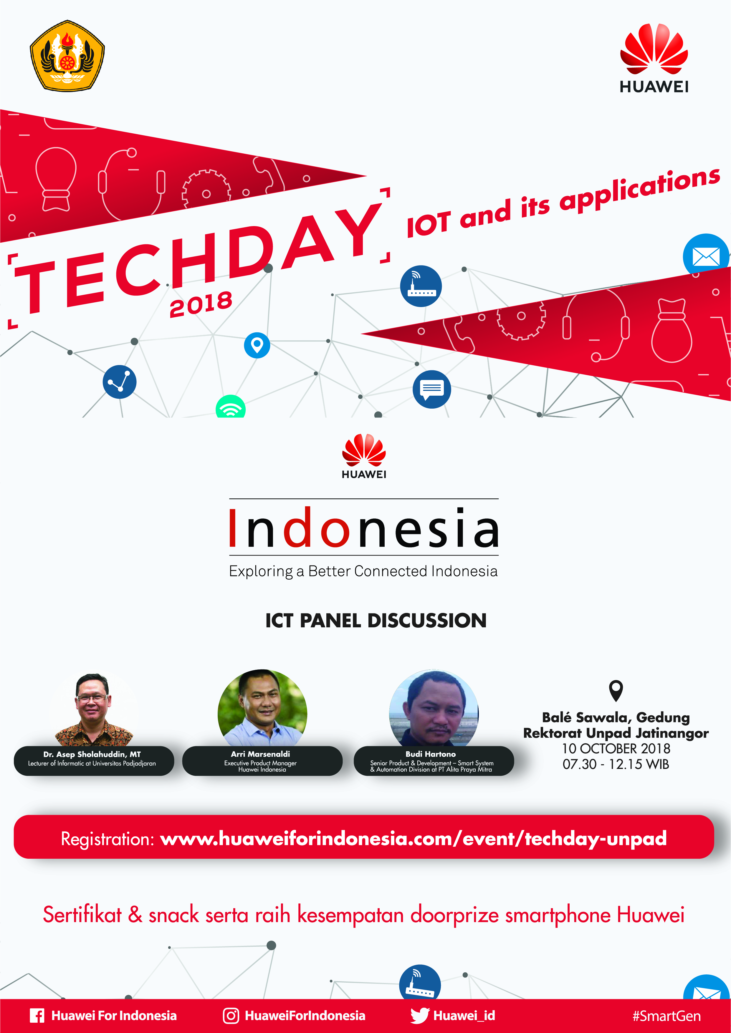unpad.ac.id, 10/10/2018] Perusahaan teknologi Huawei dan Universitas Padjadjaran kembali menggelar seminar “Techday” sebagai ajang berbagi informasi mengenai perkembangan teknologi informasi terkini. Tahun ini, Techday mengangkat tema “IoT and its Applications”, digelar di Bale Sawala Gedung Rektorat Unpad kampus Jatinangor, Rabu (10/10).