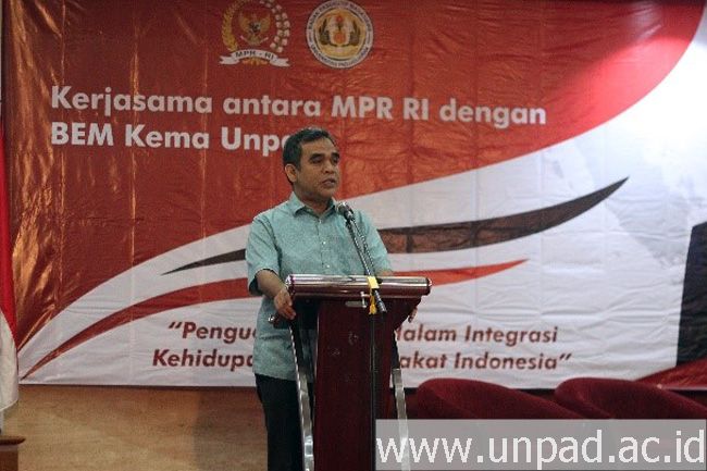 Hal tersebut ia sampaikan saat menjadi pembicara pada Sosialisasi 4 Pilar Kebangsaan dengan tema “Penguatan 4 Pilar dalam Integrasi Kehidupan Bermasyarakat Indonesia”. Acara digelar atas kerja sama BEM Kema Unpad dengan MPR RI di Graha Pos Indonesia Jalan Banda No.30 Bandung, Sabtu (17/11).