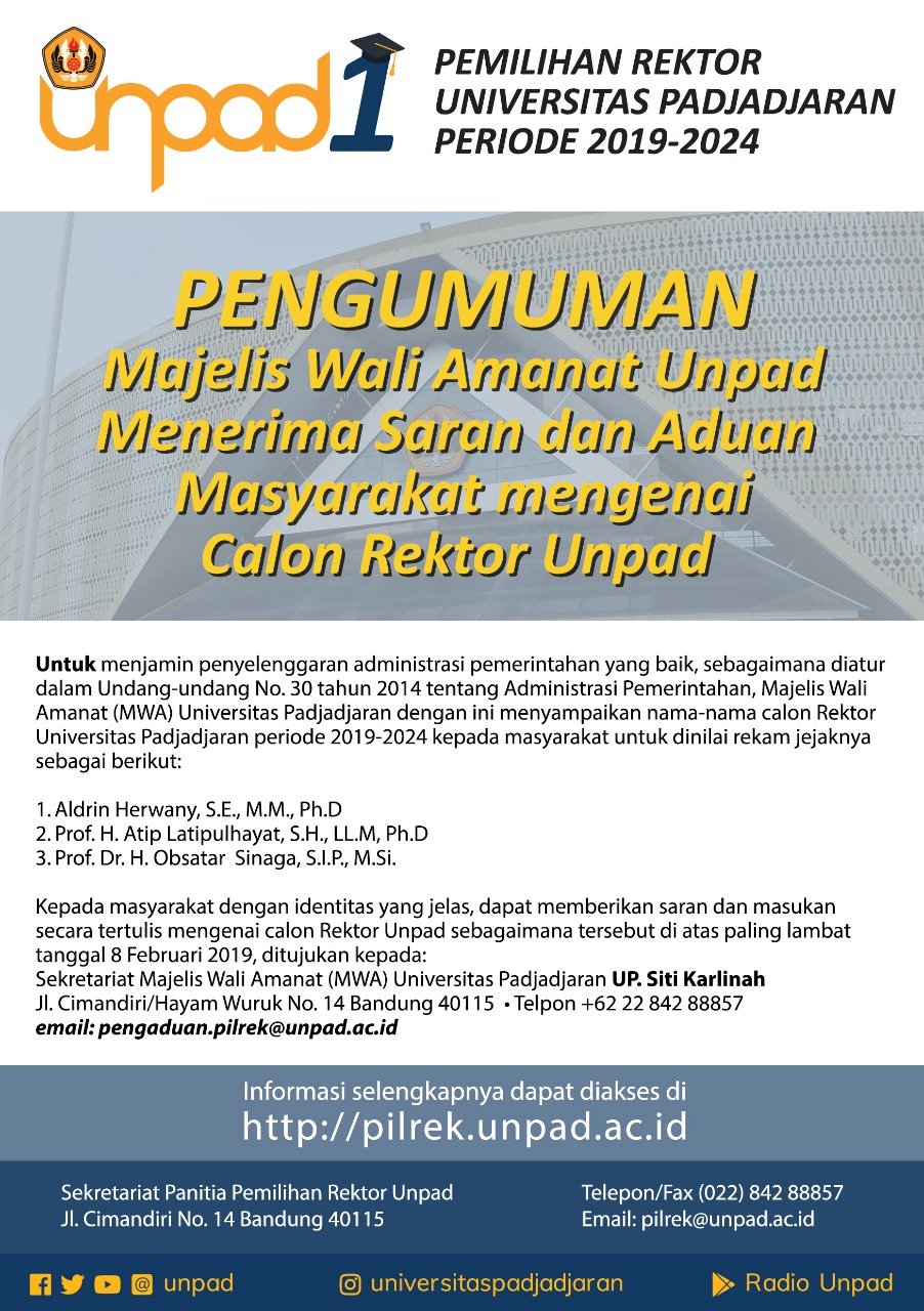 [unpad.ac.id, 31/1/2019] Sesuai dengan ikhtisar dalam rapat pleno terkait Pemilihan Rektor Universitas Padjadjaran 2019-2024, Senin (7/1) lalu, Majelis Wali Amanat Unpad akhirnya membuka layanan saran dan aduan masyarakat mengenai Calon Rektor Unpad. Pembukaan ini bertujuan untuk menjamin penyelenggaraan administrasi pemerintahan yang baik sebagaimana diatur dalam Undang-undang Nomor 30 Tahun 2014 tentang Administrasi Pemerintahan.