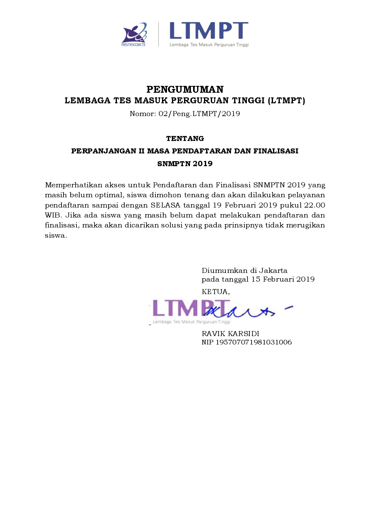 [unpad.ac.id, 16/2/2019] Lembaga Tes Masuk Perguruan Tinggi (LTMPT) kembali menetapkan batas waktu pendaftaran dan finalisasi Seleksi Nasional Masuk Pegruruan Tinggi Negeri (SNMPTN) 2019 diperpanjang hingga Selasa, 19 Januari 2019. Sebelumnya, masa pendaftaran SNMPTN telah diperpanjang hingga 16 Februari 2019. Perpanjangan ini didasarkan atas dasar belum semua siswa yang dinilai layak sebagai peserta SNMPTN melakukan pendaftaran dan finalisasi. Pendaftaran SNMPTN dilakukan pada laman web.snmptn.ac.id. *