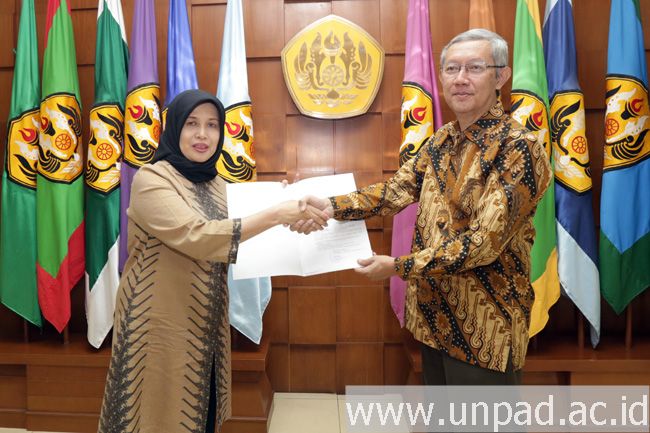 Penyerahan tersebut disaksikan juga oleh Wakil Rektor Bidang Keuangan dan Sumber Daya Unpad Prof. Arief Sjamsulaksan Kartasasmita, dr., SpM(K), M.Kes., PhD, Ketua Dewan Profesor Unpad Prof. Dr. Sutyastie Soemitro Remi, S.E., M.S., Direktur Sumber Daya Manusia Drs. Gatot Riwi Setyanto Unpad, M.Si., dan Dekan FEB Unpad Yudi Azis, S.Si., S.E., S.Sos., M.T., Ph.D.