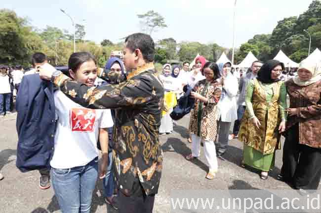 Pelaksana Tugas Rektor Universitas Padjadjaran Prof. Dr. Rina Indiastuti, M.SIE., memakaikan jas almamater kepada mahasiswa sebagai simbolis pelepasan KKN Tematik Kewirausahaan. Pelepasan digelar di pelataran Kawasan Sains dan Teknologi kampus Unpad, Jatinangor, Jumat (12/7). (Foto: Tedi Yusup)*