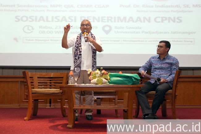 Deputi Bidang Politik, Hukum, Pertahanan dan Keamanan Kementerian Perencanaan Pembangunan Nasional/Badan Perencanaan Pembangunan Nasional Dr. Ir. Slamet Soedarsono, MPP, QIA, CRMP, CGAP, menyampaikan materi seputar pembekalan dunia kerja di lingkungan Bappenas dalam acara Sosialisasi Penerimaan CPNS Kementerian Perencanaan Pembangunan Nasional/Badan Perencanaan Pembangunan Nasional di Bale Sawala Gedung Rektorat Unpad Jatinangor, Rabu (23/10). (Foto: Arief Maulana)*