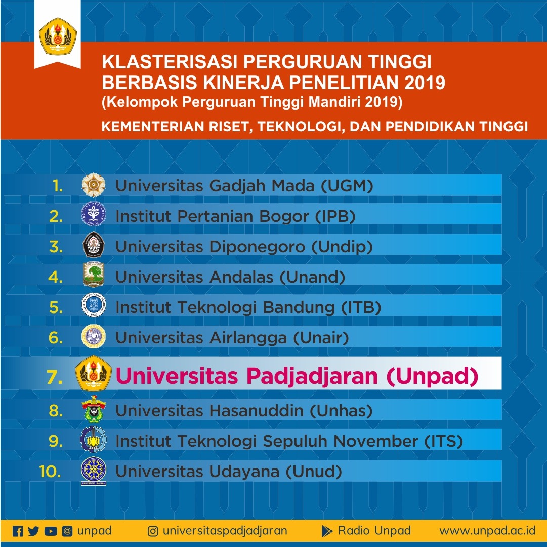 [unpad.ac.id, 20/11/2019] Universitas Padjadjaran meraih peringkat 7 dalam penilaian kinerja penelitian perguruan tinggi periode 2016-2018 yang dilakukan Kementerian Riset dan Teknologi/Badan Riset dan Inovasi Nasional RI. Dengan peringkat ini, Unpad masuk ke dalam kelompok mandiri.
