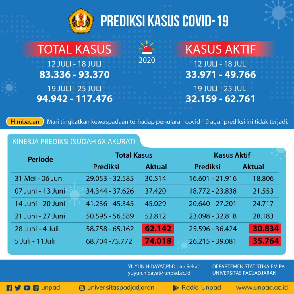 Sebelumnya, statistikawan Unpad melakukan prediksi untuk periode 5 – 11 Juli dengan data nyata angka kasus dan kasus aktif Covid-19 yang diumumkan pemerintah pada 11 Juli lalu.