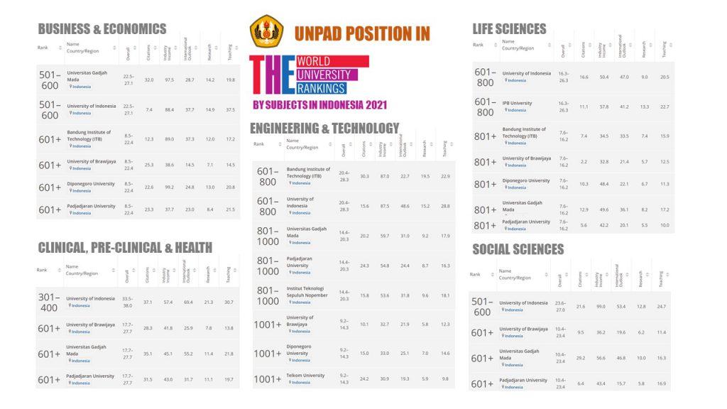 Tahun ini, lima bidang ilmu di Unpad berhasil masuk ke dalam pemeringkatan. Lima bidang ilmu tersebut antara lain Business and Economics (peringkat 601+), Cilnical, Pre-clinical, and Health (peringkat 601+), Engineering and Technology (peringkat 801-1000), Life Sciences (peringkat 801+), serta Social Sciences (peringkat 601+).