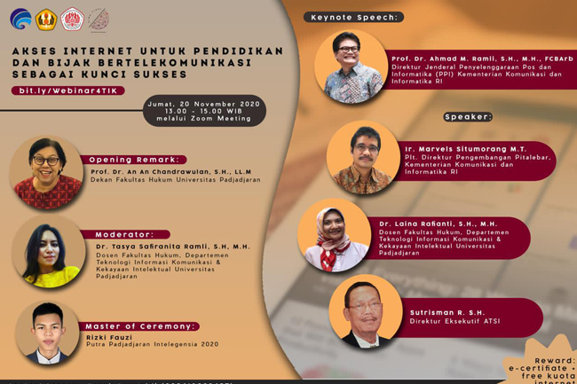 [unpad.ac.id, 25/11/2020] Fakultas Hukum Universitas Padjadjaran melalui Himpunan Mahasiswa Hukum Teknologi Informasi Kekayaan Intelektual dan BEM FH Unpad menggelar seminar daring “Akses Internet untuk Pendidikan dan Bijak Bertelekomunikasi Sebagai Kunci Sukses”, Jumat (20/11).