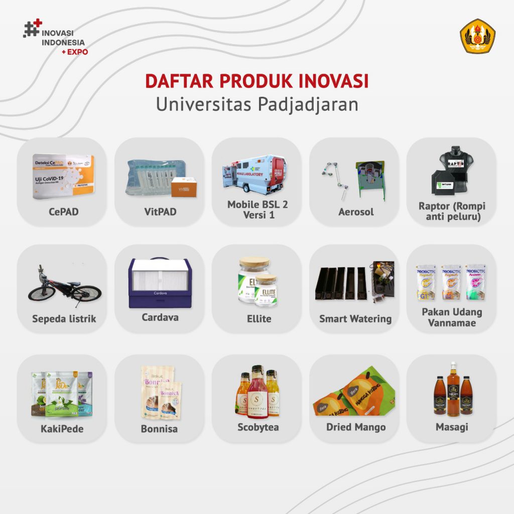 [unpad.ac.id, 10/11/2020] Sejumlah produk inovasi unggulan Universitas Padjadjaran dipamerkan pada ajang Inovasi Indonesia Expo 2020 yang digelar Kementerian Riset dan Teknologi/Badan Riset dan Inovasi Nasional atau Kemenristek/BRIN secara virtual, Selasa (10/11) hingga Jumat (13/11).