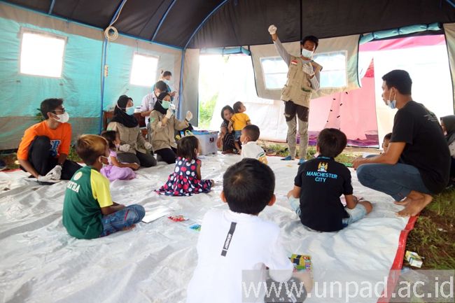 Relawan gabungan Universitas Padjadjaran sedang melakukan proses trauma healing terhadap anak-anak penyintas bencana tanah longsor di Kampung Bojong Kondang, Desa Cihanjuang, Kecamatan Cimanggung, Sumedang.*