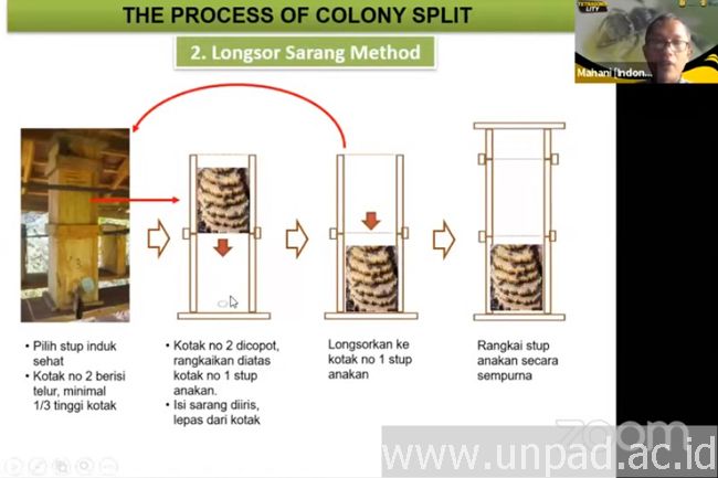Pada kesempatan tersebut, Dr. Mahani, M.Si menyampaikan berbagai manfaat metode split colony atau pecah koloni untuk lebah tanpa sengat. Metode ini salah satunya bermanfaat dalam menjaga keberlanjutan koloni juga lingkungan.