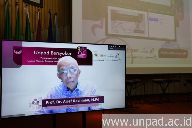 Tokoh pendidikan nasional Prof. Arief Rachman Hakim memberikan ceramah pada acara Unpad Bersyukur “Optimisme dan Syukur: Unpad Menuju Transformasi Hybrid University” yang disiarkan secara langsung dari Bale Sawala Gedung Rektorat Unpad, Jatinangor, Jumat (10/9). (Foto: Dadan Triawan)*