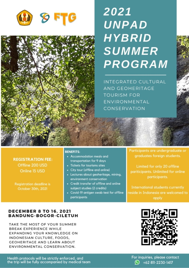 [Kanal Media Unpad] Kantor Internasional Universitas Padjadjaran bersama Fakultas Teknik Geologi akan menggelar “Unpad Hybrid Summer Program 2021” pada tanggal 8 – 16 Desember 2021. Acara ini mengangkat tema Integrated Cultural  and Geoheritage Tourism For Environmental Conservation.