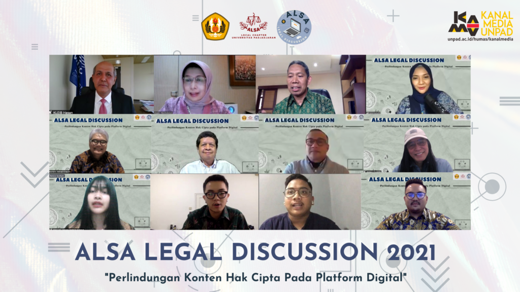 [Kanal Media Unpad] Organisasi kemahasiswaan “Asian Law Students Association Local Chapter Universitas Padjadjaran (ALSA LC Unpad) menggelar kegiatan Legal Discussion bertema “Perlindungan Konten Hak Cipta pada Platform Digital” secara virtual, Selasa (9/11/2021) lalu.