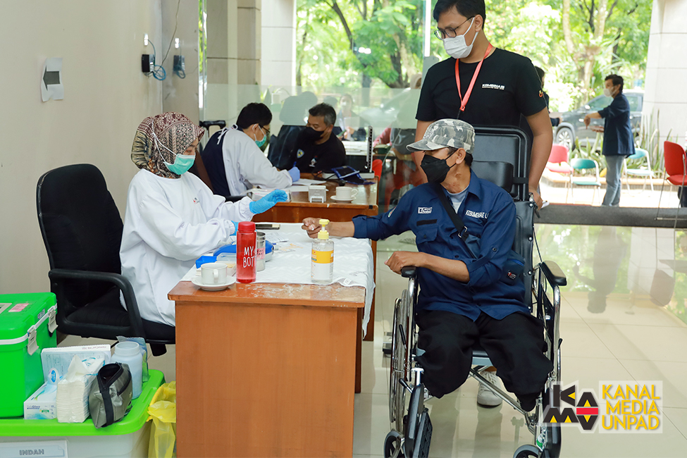 Masyarakat penyandang disabilitas berpartisipasi dalam aksi donor darah yang dilakukan Unit Komunikasi Bina Aksi (Kombinasi) Fakultas Ilmu Komunikasi Universitas Padjadjaran yang digelar di kampus Fikom Unpad, Jatinangor, Selasa (15/2/2022). (Foto: Dadan Triawan)*