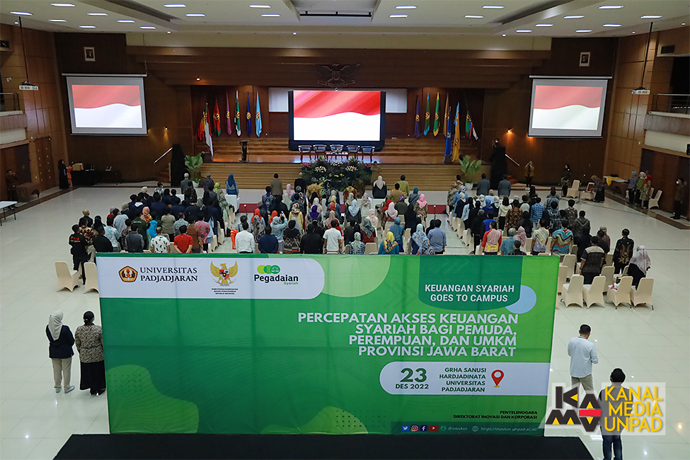 Suasana sosialisasi keuangan syariah bertajuk Keuangan Syariah Goes to Campus “Peningkatan Inklusi Keuangan bagi Pemuda, Perempuan, dan UMKM Provinsi Jawa Barat" yang diselenggarakan di Grha Sanusi Hardjadinata Unpad Kampus Iwa Koesoemasoemantri, Bandung, Jumat (23/12/2022). (Foto: Dadan Triawan*