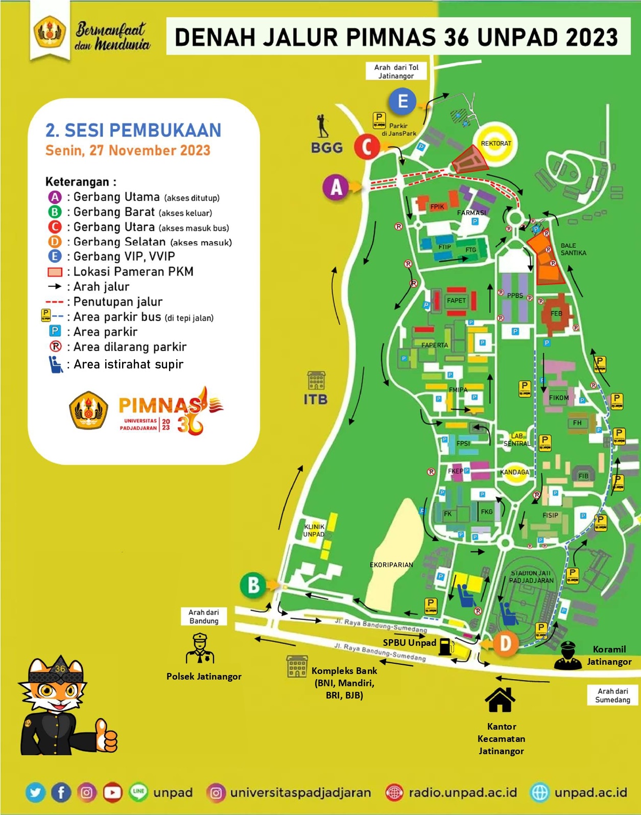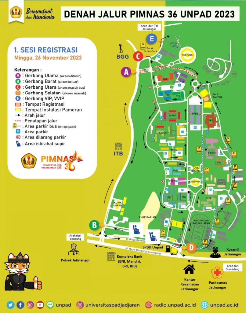 Kegiatan pembukaan Pimnas 36 akan digelar di halaman Gedung Rektorat Unpad, Jatinangor, Senin (27/11/2023). Pada kegiatan ini, ada rekayasa jalur yang akan diterapkan.