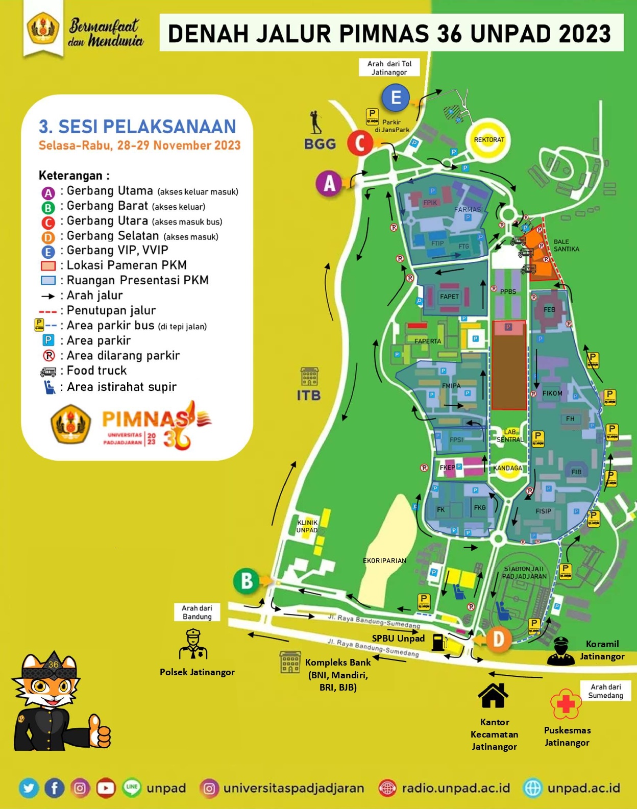 Kepala Pusat K3L Unpad Dr. Teguh Husodo, M.Si., mengatakan, selama kegiatan Pimnas 36 berlangsung, Unpad memberlakukan sistem satu arah untuk sejumlah jalur utama di dalam kampus Jatinangor. Hal ini dilakukan mengingat jalur utama tersebut sebagian akan digunakan untuk tempat parkir kendaraan kecil peserta Pimnas.