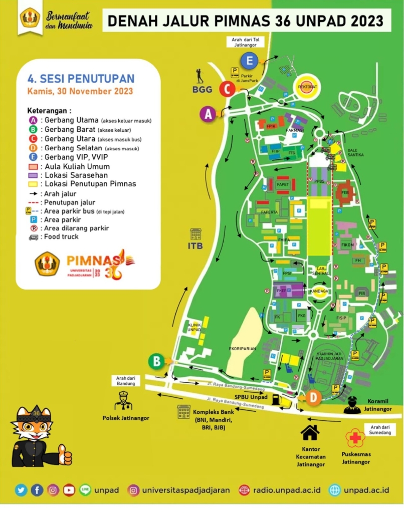 Teguh memaparkan, selama kegiatan pembukaan Pimnas, gerbang A akan ditutup mulai pukul 5.00 – 6.00 WIB. Akses kampus Unpad akan menggunakan gerbang C dan gerbang D. Peserta dari arah tol Purbaleunyi bisa keluar dari gerbang Cileunyi atau masuk ke tol Cisumdawu dan keluar ke gerbang Jatinangor.