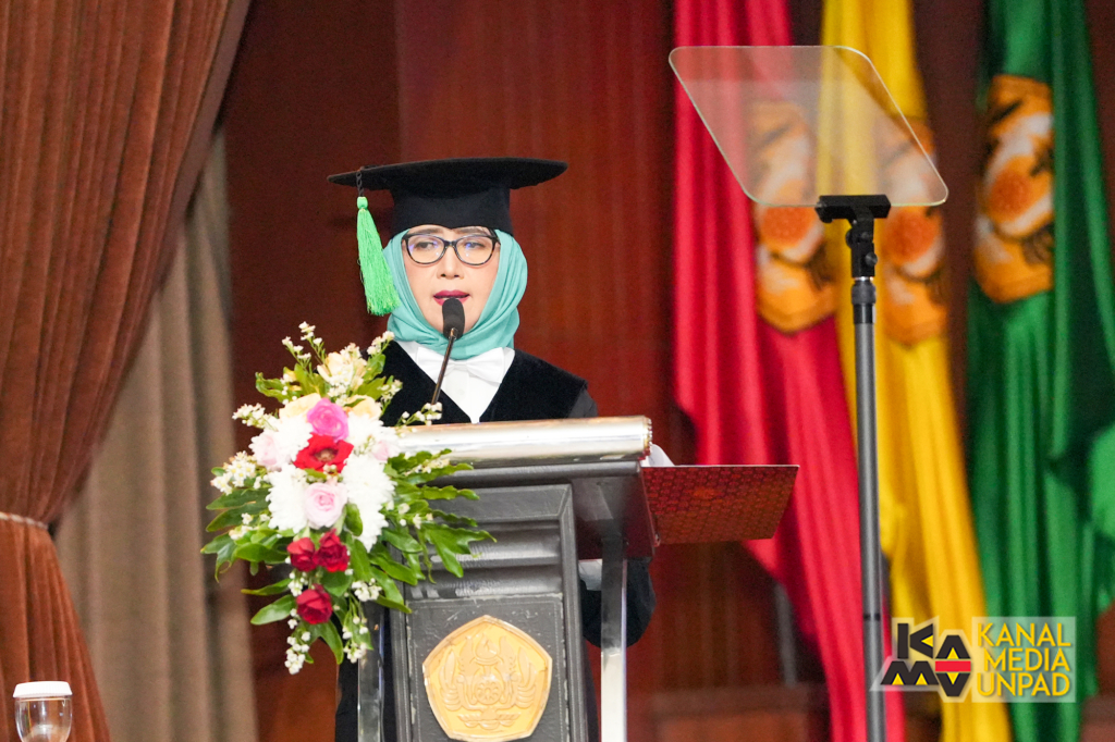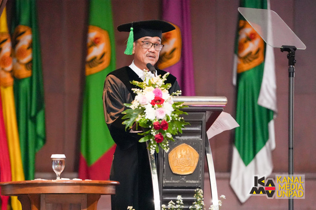 Guru Besar Bidang Ilmu Administrasi dan Kebijakan Kesehatan Prof. Deni Kurniadi Sunjaya menyampaikan orasi ilmiah yang berjudul “Menyiapkan Lansia Mandiri dan Sehat Holistik Menuju Indonesia Emas”.