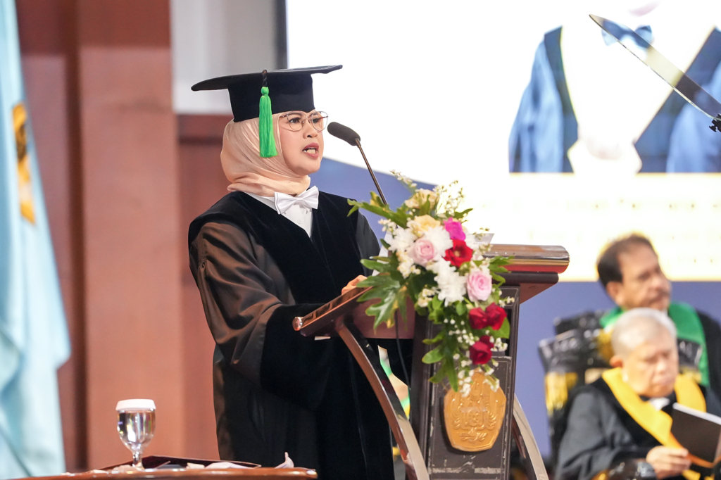 Prof. Dr. Dewi Marhaeni Diah Herawati, drg. M.Si. membacakan orasi ilmiahnya yang berjudul “Mengelola Gizi untuk Keunggulan Bangsa”. Prof. Dewi diangkat sebagai guru besar bidang Ilmu Administrasi dan Kebijakan Kesehatan.
