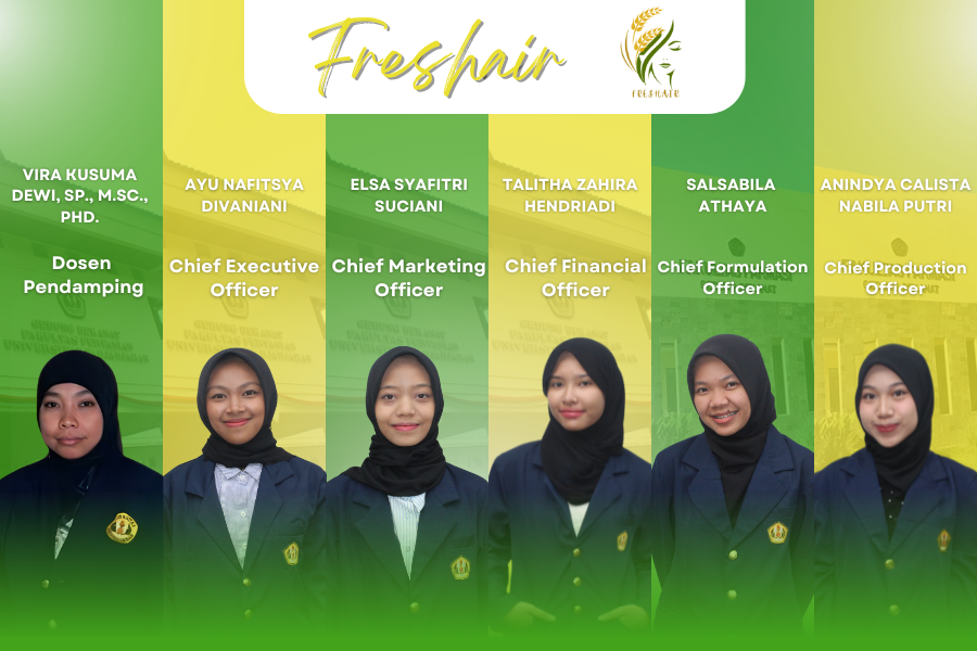 Bernamakan “Freshair”, produk ini dibuat oleh Ayu Nafitsya Divaniani (Agroteknologi), Elsa Syafitri Suciani (Agroteknologi), Talitha Zahira Hendriadi (Agribisnis), Salsabila Athaya (Farmasi), dan Anindya Calista Nabila Putri (Farmasi) dengan dosen pendamping Vira Kusuma Dewi, M.Sc., PhD.