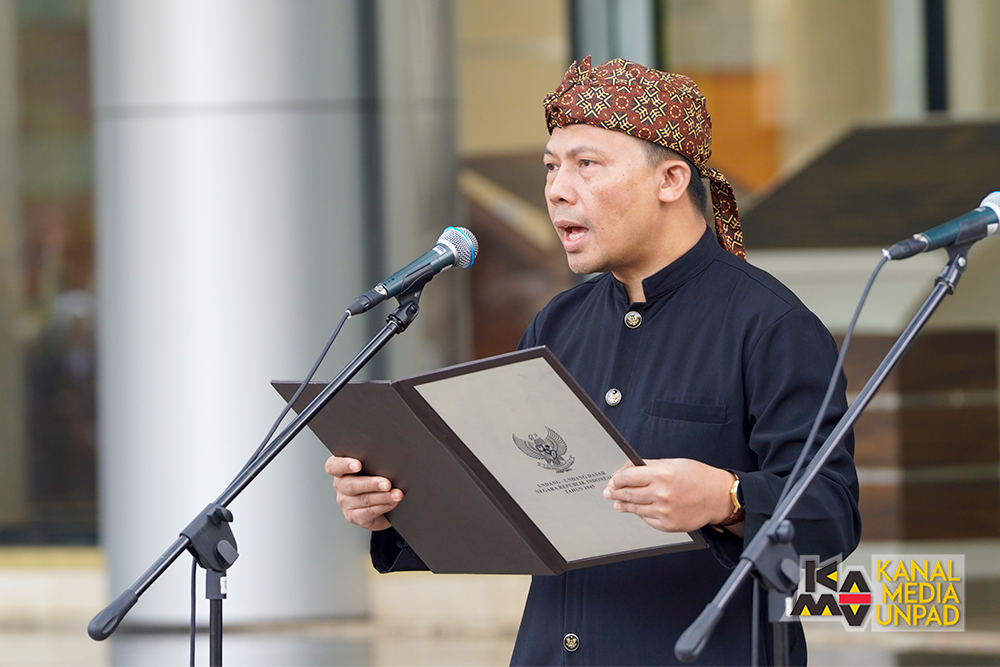 Pada upacara tersebut, bertindak sebagai Pemimpin Upacara adalah Dekan Fakultas Ilmu Komunikasi Unpad Dr. Dadang Rahmat Hidayat, S.H., S.Sos., M.Si., pembaca Naskah Pembukaan UUD 1945 oleh Fakultas Kedokteran Gigi Unpad Dr. Dudi Aripin, drg., Sp.KG., serta pembaca doa oleh Dekan Fakultas Matematika dan Ilmu Pengetahuan Alam Unpad Prof. Dr. Iman Rahayu, S.Si., M.Si.