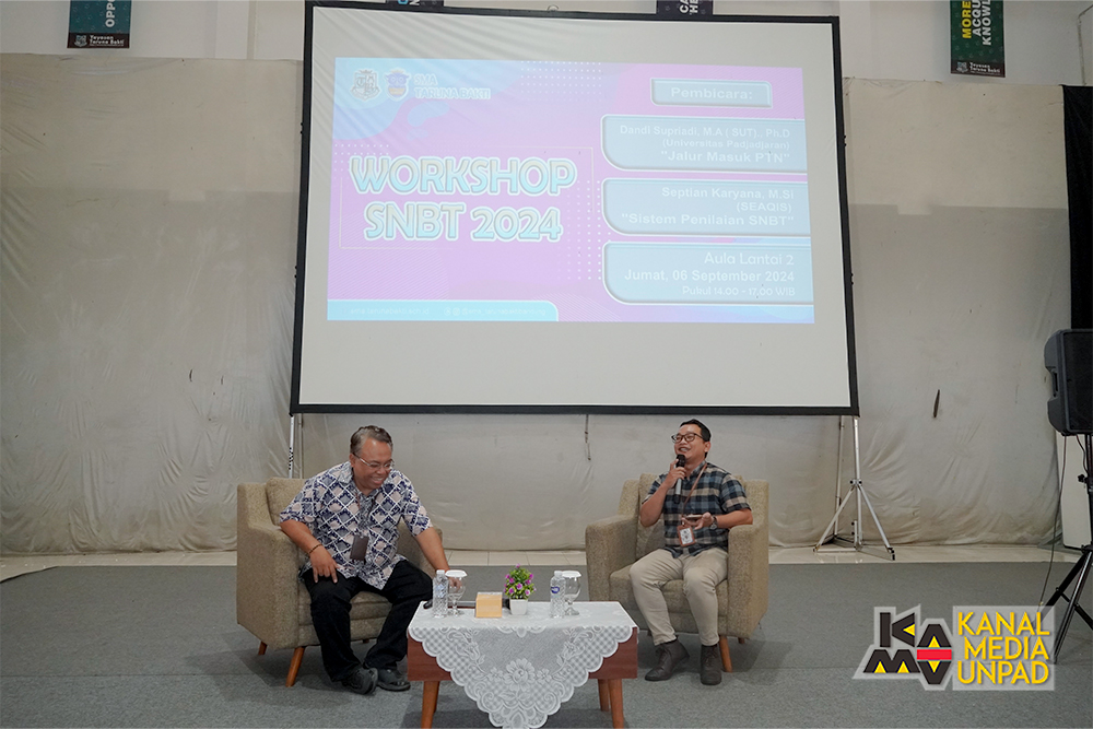 [Kanal Media Unpad] Universitas Padjadjaran memperkenalkan jalur seleksi masuk mahasiswa baru pada kegiatan Workshop SNBT yang diselenggarakan oleh SMA Taruna Bakti Bandung. Selain jalur SNBT, Unpad juga memaparkan jalur seleksi SNBP dan jalur seleksi mandiri.