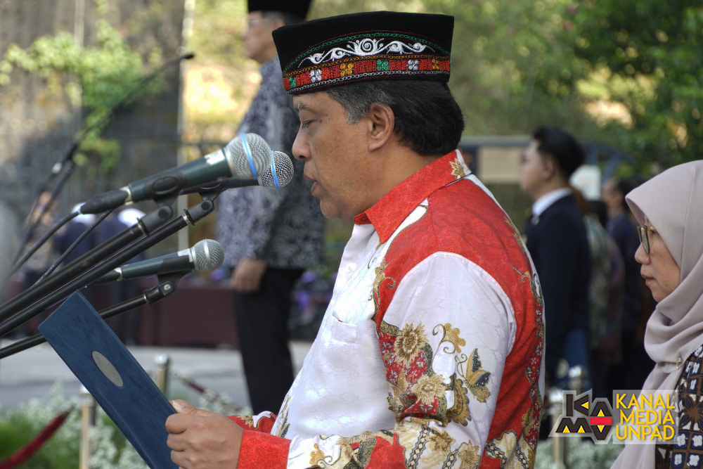 Rektor Unpad Prof. Arief Sjamsulaksan Kartasasmita yang pada kesempatan tersebut bertindak sebagai Pembina Upacara membacakan pidato Menteri Pemuda dan Olahraga Republik Indonesia Ario Bimo Nandito Ariotedjo.